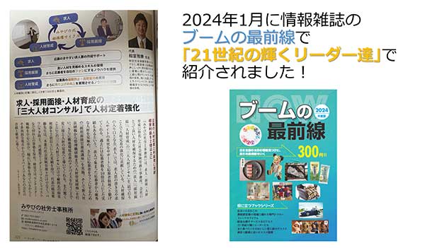- 令和6年 星雲社が発行する「ブームの最前線」という情報雑誌に3大コンサルが紹介され、人事コンサルだけで経常利益が2倍以上になったことが紹介される。